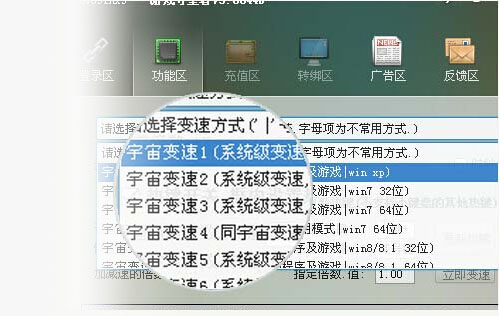 点击"功能区",选择自己计算机系统对应的变速方式,(部分特殊程序或游戏则选择字母项特殊变速方式).等待加速火箭发射成功.