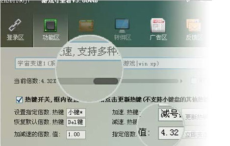 3.增加几种特殊的变速方式,变速齿轮型/内存变速型/隐藏变速型等,目前由于部分网络游戏有提速器的检测模块,有时会提示"游戏环境异常","非法模块","发现提速器","Hackspeed",等,这时您可以更换使用b版本新增加的字母开头的变速方式即可屏蔽绝大部分提示(仅供测试之用,请勿用于作弊或其他非法用途).