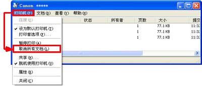 3. 在“打印机”菜单中,单击“取消所有文档”(在 Windows Vista / XP / 2000 中)或者“清除打印文档”(在 Windows ME / 98 中)。