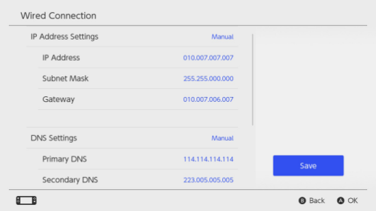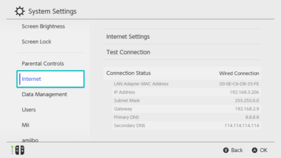 设定 →网络 → 设定互联网连接 → 使用LAN连接线 → 定制 → 手动 →填入加速成功后给的信息 →MTU设定(自动) →Proxy服务器(不使用)→测试互联网连接