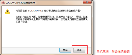 5、提示无法连接到SOLIDWORKS服务器,点击取消。