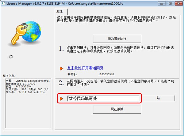 再次打开easyrecovery软件,在激活界面“激活代码填写框”内输入所获取的激活代码(注意:不是您的序列号哦),点击“现在激活”按钮。