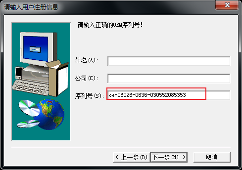 3、填写姓名、公司,以及序列号【oem06026-0636-030552085353】,如图所示: