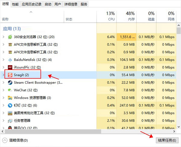 5、先进入任务管理,将Snagit进程结束,这里如果保持软件后台运行,会导致下一步复制破解补丁无效;
