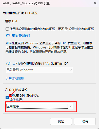 3、勾上最下方的替代高DPI缩放行为,并在下拉框选择应用程序,之后就可以在游戏里设置高分辨率了!