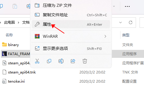 1、找到并右键点击游戏的执行程序“FATAL_FRAME_MOL.exe”,左键点击属性