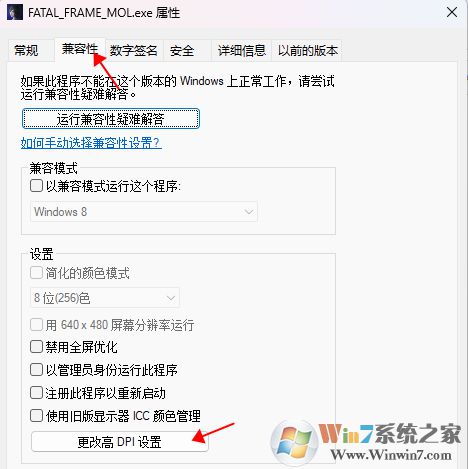 2、接着来到下方窗口,依次点击兼容性—>更改高DPI设置