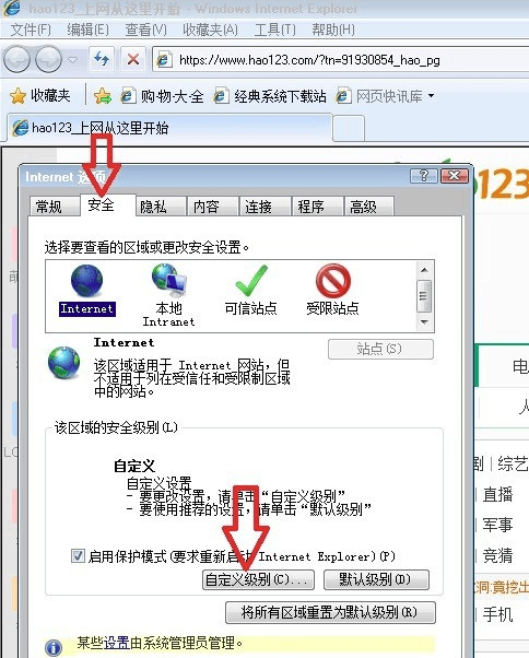 2、在ie8浏览器(Internet Explorer 8)“Internet 选项”界面选择【安全】——【自定义级别】