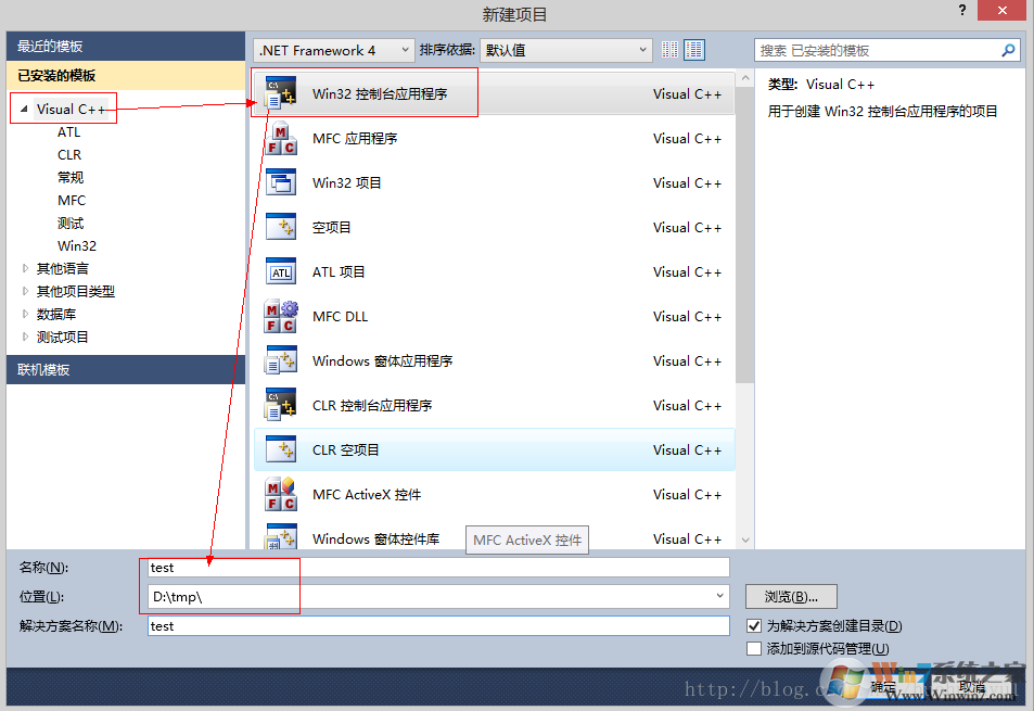 运行vs10,点击【新建项目】,弹出如下新建项目框,选择【Visual c++】—>【win32控制台应用程序】,输入项目名称和位置,也可选择默认,然后单击【确定】。