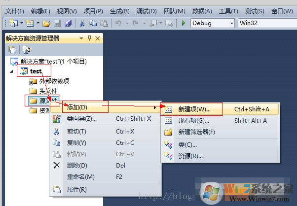然后,在项目左侧栏就可以看到刚才新建的项目了(本人创建的是test),然后,右键【源文件】—>【添加】—>【新建项】,如下: