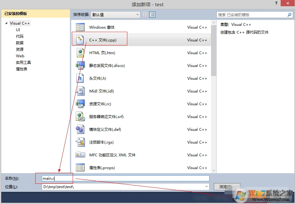 然后,弹出如下添加新项框,选择【c++文件】,输入文件名称,点击【添加】即可。