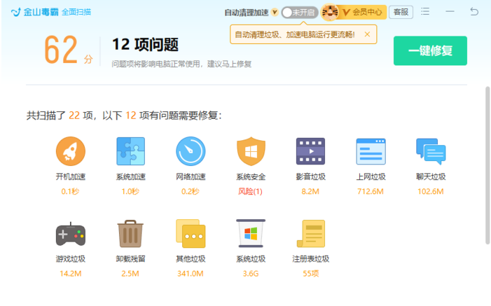 日常使用最注重的是简单便捷,拒绝繁琐。金山毒霸青春版拥有一键体检功能,可以一键帮助用户进行电脑系统体检,快速检测出系统中可能存在的问题。对于检测到的问题,用户同样可以一键进行问题的修复,完成系统的清理优化操作,对电脑小白来说非常易用。