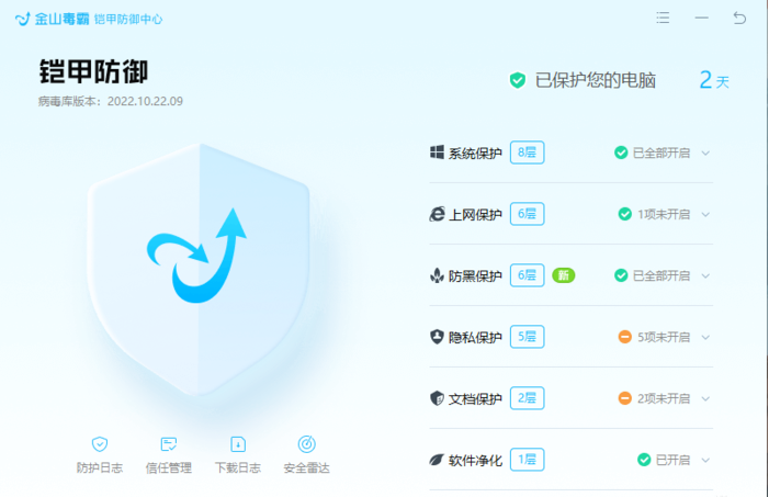 金山毒霸青春版拥有"铠甲防御"系统,可以多方面深度保护用户电脑系统安全。其中的隐私保护以及文档保护两个实用的防护功能,帮助用户保护隐私安全。软件净化功能则可以最大程度的帮助用户防范流氓软件。