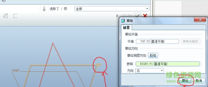 4.点击选择TOP平面,点击草绘开始绘制。