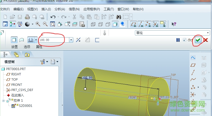 7.如图所示,可以在拉伸长度中输入你想要拉伸的长度,然后点击打钩符号完成圆柱的绘制。