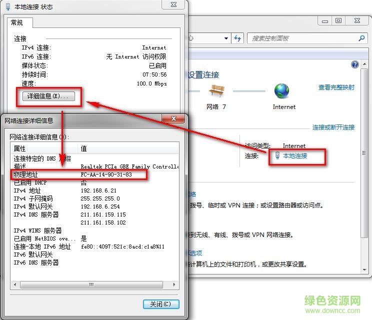 2.点击“本地连接”,然后点“详细信息”,弹窗的第三行就是“物理地址”,复制下来,等会要用到。