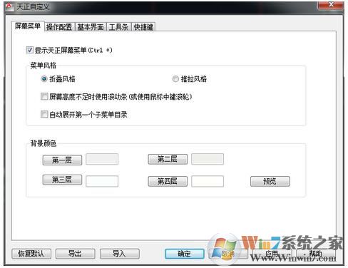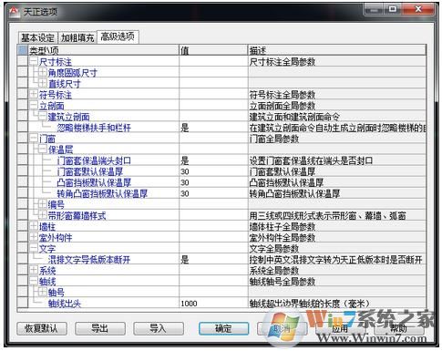 通过【自定义】和【天正选项】可以进行软件界面形式及操作命令方面、建筑设计参数方面的定制设置。此设置可以导出成XML文件,供贵单位其他用户导入,实现参数配置的共享,也可通过“恢复默认”恢复程序最初设置值。