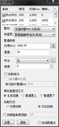热力管道:有热水供水、热水回水、蒸汽管道等多种管道可以绘制,其中可以设置管材、保温层、负荷及坡度等信息。