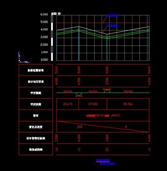 选取界面上的一段管道,根据走势生成对应的纵剖面图,并且可以在剖面图上面直接做调整,然后将调整好的剖面图返回平面图中,从而在剖面图中解决了管道打架等可以发生的碰撞现象。 高级设置里面可以对纵断面的绘制做详细的设置,包括行间距,字高字宽及所要列出的表头项。
