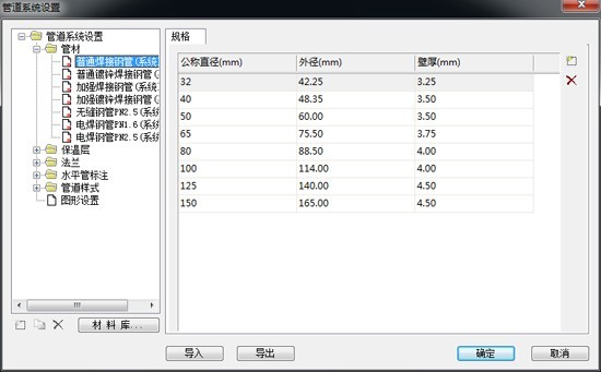 设置管道系统参数,用于设置绘制管道过程中用到的管材、规格、保温层、法兰及标注样式。