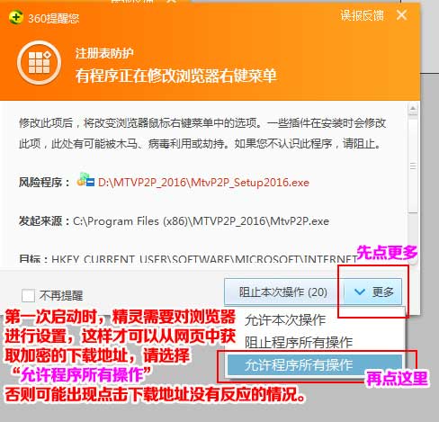 第一次运行,可能会出现这样的提示,这是因为精灵必须修改注册表来配置软件,修改浏览器来获得加密的下载地址。我们的操作都是久经考验的,绝对安全,精灵十年,百万用户,请大家放心使用。遇上安全提示,请一律选择“允许程序所有操作”,否则精灵可能无法正常运行。