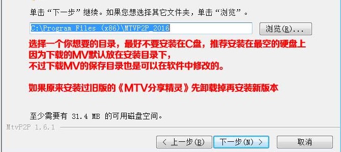 5、选择安装目录,不要安装在C盘,因为下载的MV默认保存在安装目录中,而下载的MV是很占空间的,请修改安装目录为一个最大的硬盘上。