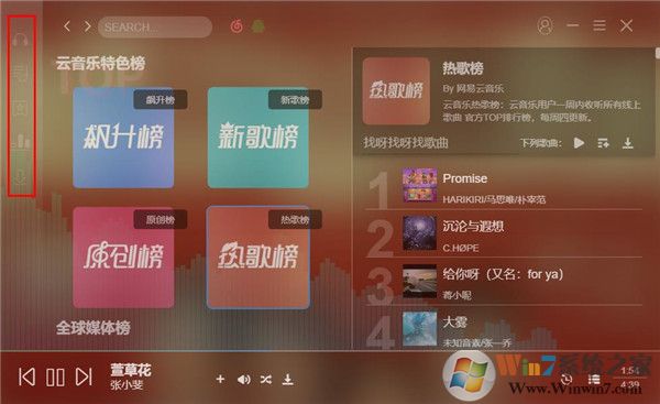 2、在软件的左侧是菜单栏,主要分为首页,账号登录,热门歌单,以及云音乐特色排行榜、下载等功能,非常的简单好用