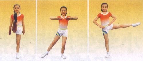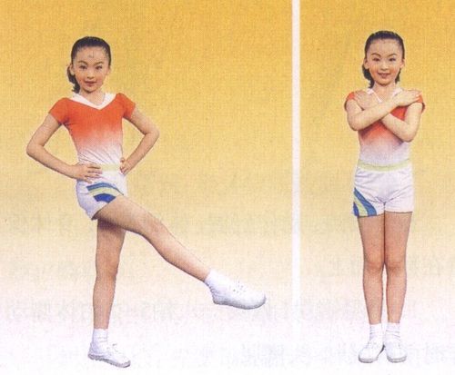 1左脚向前迈一步,右脚尖点地,同时两臂前平举,掌心向下。 2右腿前踢,同时两臂下摆后振。 3同1 4还原成直立 5左腿屈膝,同时右腿侧伸脚尖内侧点地,两臂成胸前平屈。 6还原成直立 7同5 8同6
