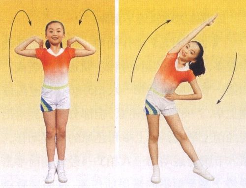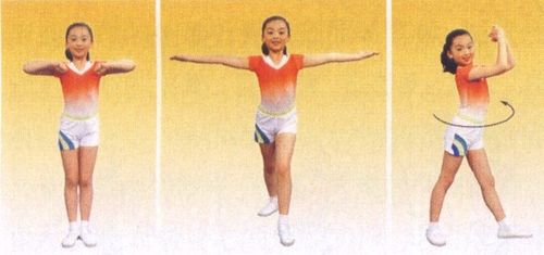 1-2成开立,两臂经侧上举,五指分开,于头上交叉两次 3-4左臂叉腰,右臂肩侧上屈,手扶头后。上体左转90° 5-6右手叉腰,左臂经前由最近点至前举,上体右转。 7-8还原成直立