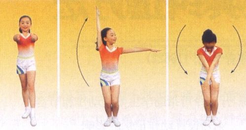 第三个八拍 1跳成开立,同时两臂前举。 2小跳一次。 3跳起,同时两臂上举。 4小跳一次。 5跳起成开立,同时两臂侧举。 6跳起成并立,同时两臂还原于体侧。 7跳起成开立,同时两臂侧举。 8跳起成并立,同时两臂还原于体侧。