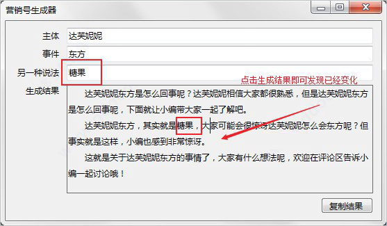 另外一种就需要点击生成结果才可发生变化,以上就是营销号生成器使用方法了;