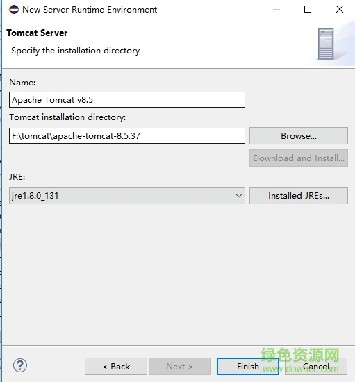 17.小编这里是8.5版本所以选择的8.5(如图),jre那个就是刚刚安装的jdk版本,点击finish