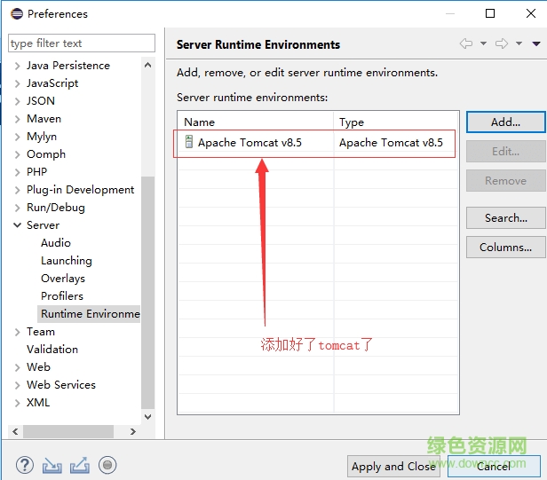 18.可以看到tomcat服务器了,点击apply and close
