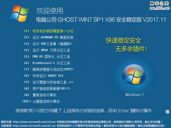 电脑公司 GHOST WIN7 SP1 X64 安全稳定版 V2017.11 官方免费版